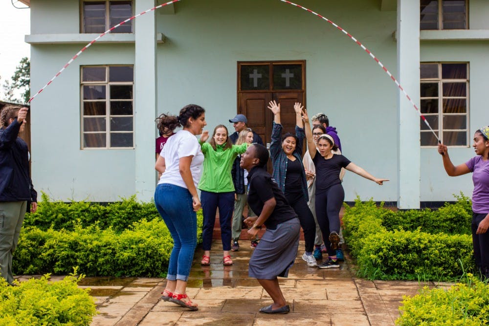 An immersion participant jumps rope with another college student in Tanzania.