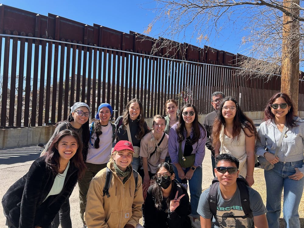A group photo taken at the border wall during the 2025 Border Immersion in Nogales, AZ. Photo courtesy of Erin Savoia.
