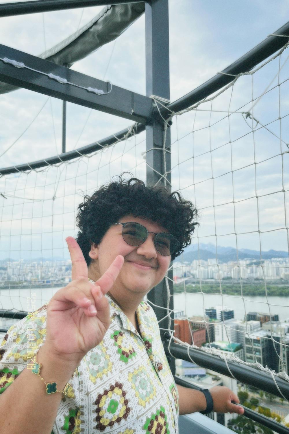 Q Acosta faces the camera while holding up a peace sign. Acosta rode a hot air balloon as part of his Seoul Metro program. Photo courtesy of Q Acosta.