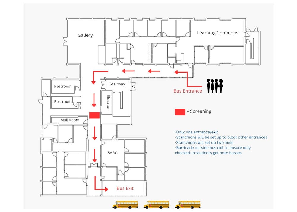 A map showing the screening and entrance route to bus transportation. Graphic courtesy of CPB.